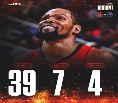 全場(chǎng)比賽杜蘭特鏖戰(zhàn)40分鐘(火箭全隊(duì)最高),18中11,三分8中6,罰球14中11,拿到39分7助攻4籃板2搶斷1蓋帽,命中率61.1%,三分命中率75%,真實(shí)命中率80.7%,正負(fù)值+15。