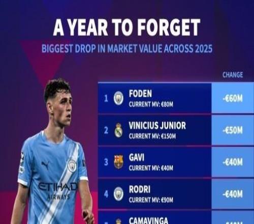25年德轉身價跌幅前10:福登跌6000萬最高,維尼修斯跌5000萬 -